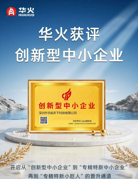 华火喜讯,征程再启!深圳市华焰天下科技有限公司(华火)凭借卓越的科技创新能力,成功斩获深圳市 “创新型中小企业” 认证!这一重要资质的获得,标志着华火正式进入了国家级优质企业培育体系,开启了从“创新型中小企业”到“专精特新中小企业”再到“专精特新小巨人”的晋升通道,为企业高质量发展注入新的政策动能。